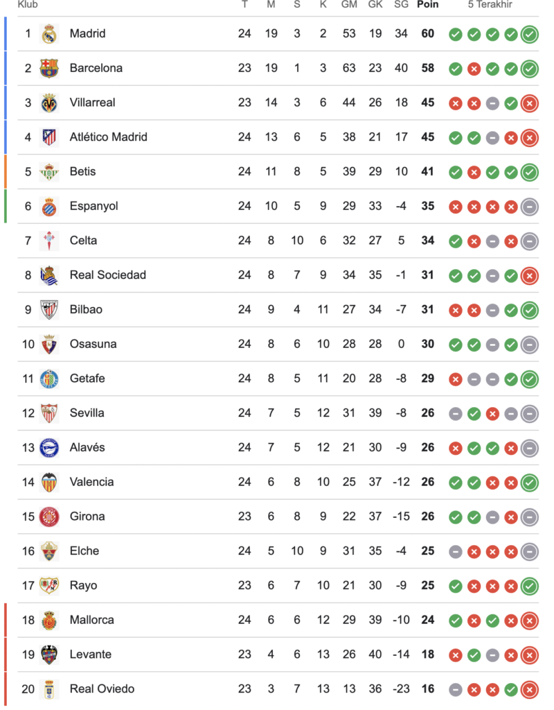 Real Madrid sementara memimpin klasemen dengan 60 poin dari 24 pertandingan. Barcelona, yang baru memainkan 23 laga, menguntit ketat dengan 58 poin.