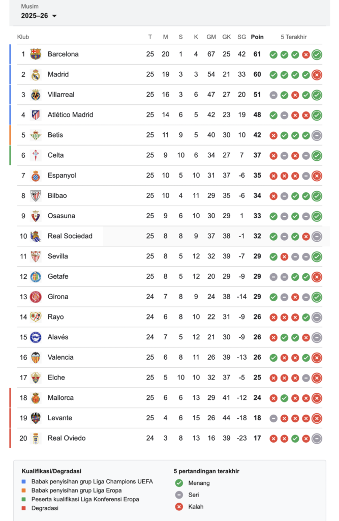 Situasi ini menunjukkan betapa ketatnya persaingan di LaLiga musim ini, di mana setiap pekan bisa mengubah peta klasemen.